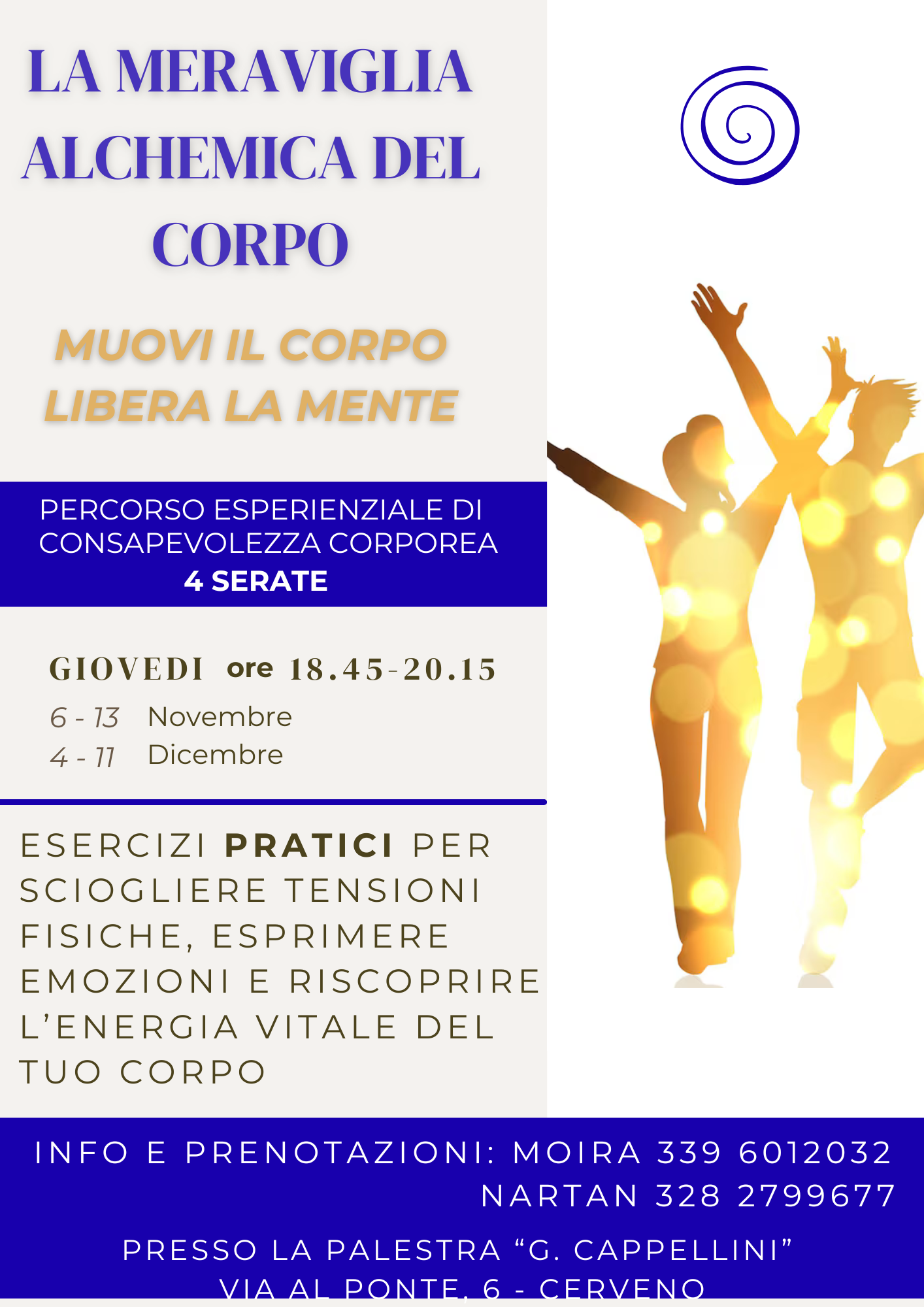 Si avvisa che presso la palestra comunale di Cerveno, nelle giornate di Giovedì 13 Novembre, 4 e 11 Dicembre 2025 dalle ore 18.45 alle ore 20.15 si terrà un percorso esperienziale di consapevolezza corporea durante il quale verranno svolti esercizi pratici per sciogliere tensioni fisiche, esprimere emozioni e riscoprire l'energia vitale del corpo.